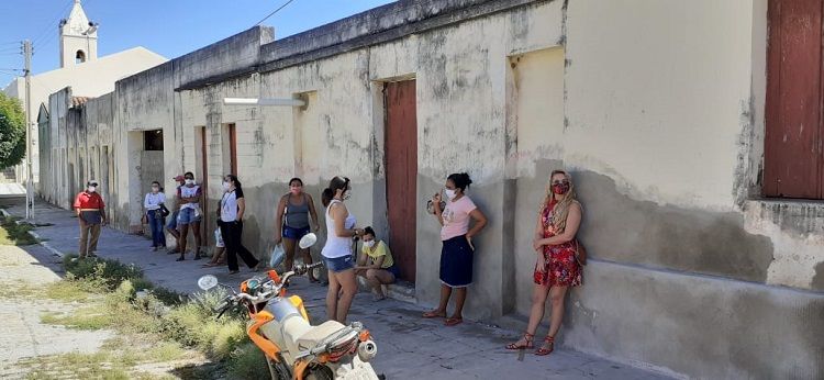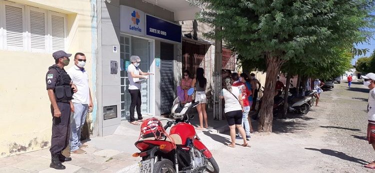 Na lotérica, foi feita a marcação para as pessoas manterem o distanciamento de 1,5m. As pessoas foram orientadas a se dividir em duas filas.