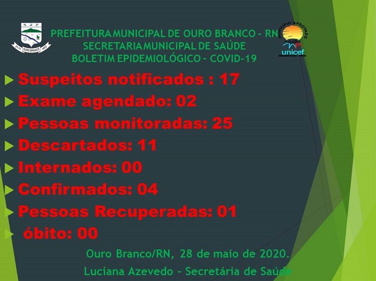 A Secretaria Municipal de Saúde informa que hoje – quinta-feira (28 de maio) recebeu resultado de exame de swab de paciente do gênero masculino, idade entre 35/45 anos, amostra coletada no sábado - 23 de maio. O resultado do exame foi detectável para COVID-19 –Positivo.