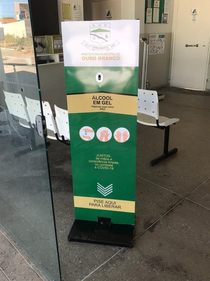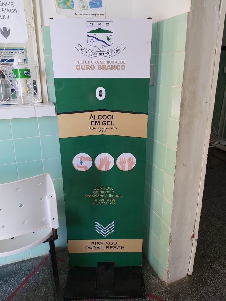 A Prefeitura Municipal de Ouro Branco fez a instalação de totens com álcool em gel na Policlínica Mãe Paula, na Sede da Secretaria Municipal de Saúde e na Unidade Básica de Saúde II. A UBS I, atualmente em reforma, também contará com o equipamento que será posto imediatamente após a conclusão dos trabalhos que lá estão sendo realizados.