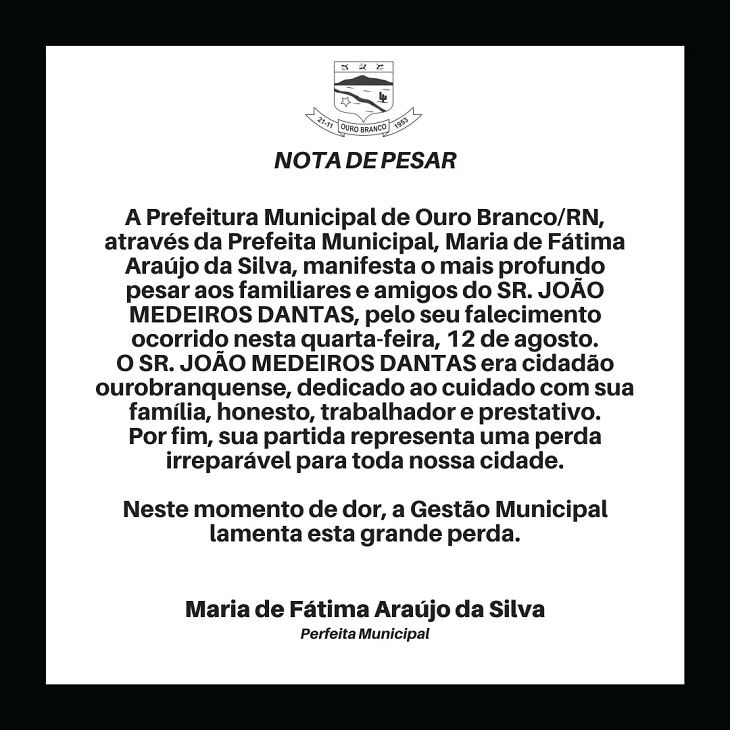 Nota de pesar da Prefeitura Municipal de Ouro Branco/RN, pelo falecimento do senhor João Medeiros Dantas.
