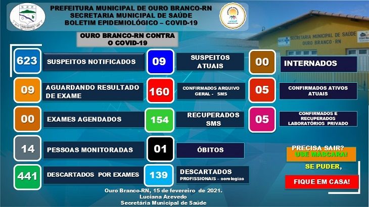 A Secretaria Municipal de Saúde de Ouro Branco informa que nas últimas 72 horas (sábado - 13, domingo - 14 e hoje, 15 de fevereiro), nossa equipe atendeu mais 06 pacientes com síndrome gripal que, após avaliados, foram considerados casos suspeitos para COVID-19. Os mesmos tiveram exames solicitados/agendados e outros já realizados, conforme a seguir: