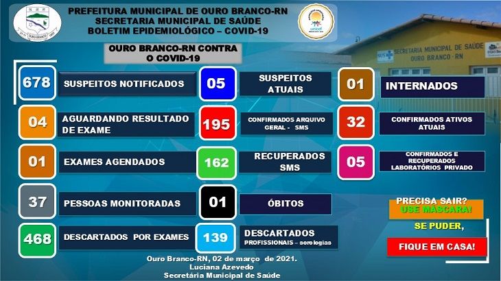 A Secretaria Municipal de Saúde de Ouro Branco informa que, nos últimos 04 dias (sábado - 27, domingo – 28, segunda-feira – 01 de março e hoje, 02 de março), nossa equipe atendeu mais 22 pacientes com sintomas sugestivos de síndrome gripal que, após avaliados, tiveram exames solicitados e alguns já realizados, conforme a seguir: