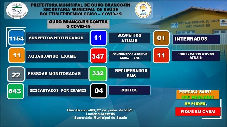 A Secretaria Municipal de Saúde de Ouro Branco informa que, nas últimas 24 horas, nossa equipe atendeu mais 02 pacientes com síndrome gripal e/ou com contatos com casos positivos, que foram considerados suspeitos de COVID-19, conforme a seguir: