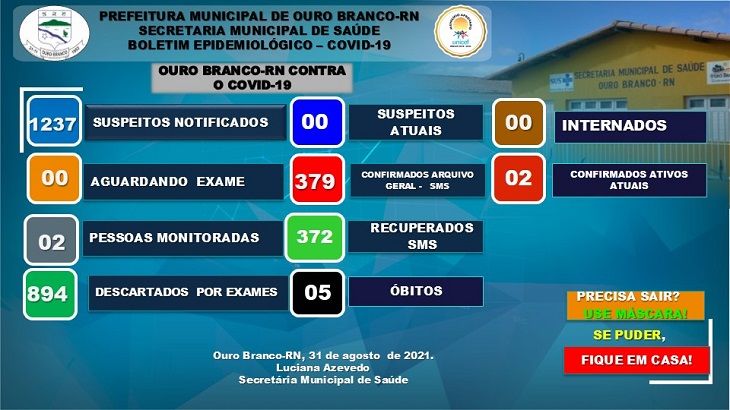 02 casos positivos ativos e 00 suspeitos aguardando exame e monitorados pelas equipes.