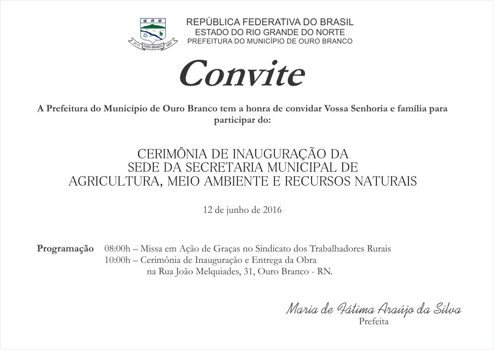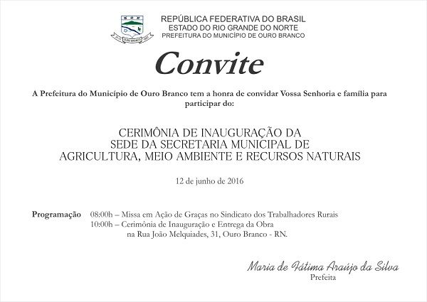 A Prefeitura do Município de Ouro Branco tem a honra de convidar Vossa Senhoria e família para participar da: