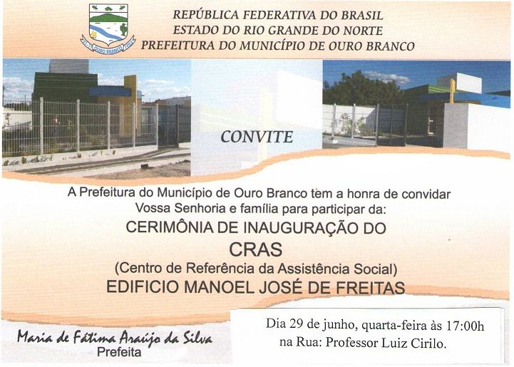 A Prefeita Drª Fátima Silva, convida toda a população ourobranquense para participar da Cerimônia de Inauguração da Sede própria do CRAS (Centro de Referência da Assistência Social.