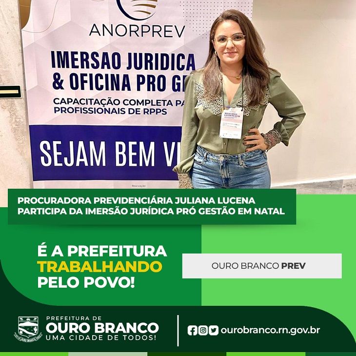 A Procuradora Previdenciária, Juliana Lucena, está participando da Imersão Jurídica Pró Gestão, promovida pela ANORPREV, que acontece de 29 a 31 de outubro em Natal-RN. Este evento reúne profissionais de Regimes Próprios de Previdência Social (RPPS) para uma capacitação abrangente, focada em temas essenciais para a gestão previdenciária.