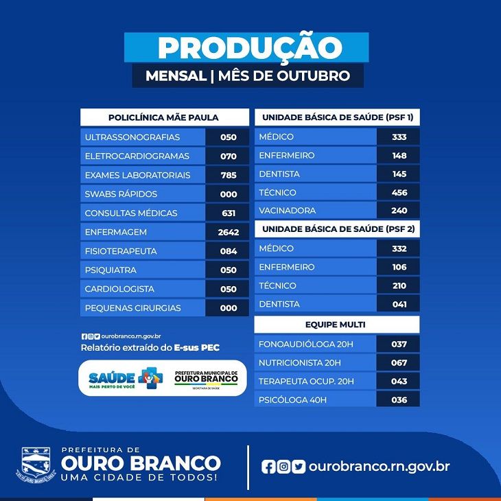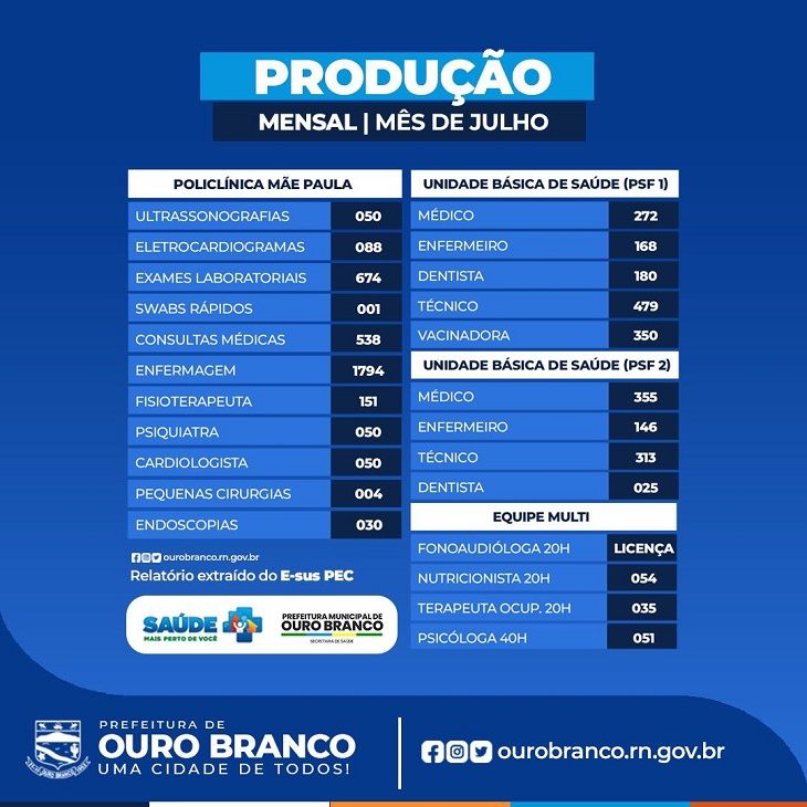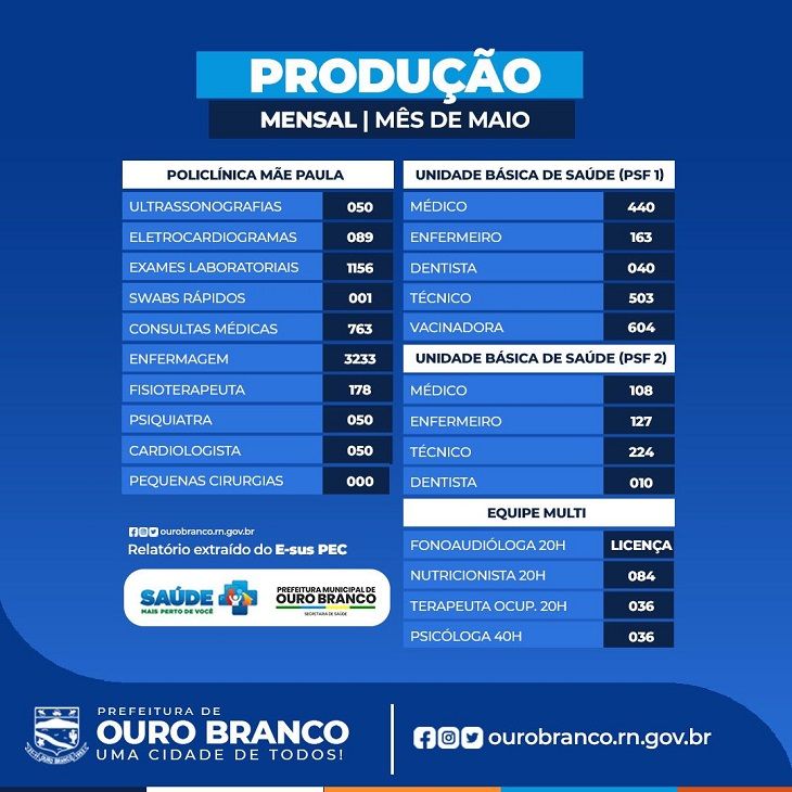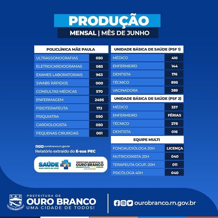 A Prefeitura de Ouro Branco, através da Secretaria de Saúde, divulga o Boletim de Produção dos últimos seis meses! Ele traz um panorama completo dos serviços prestados, reafirmando nosso compromisso com a transparência e a melhoria contínua no atendimento à população.