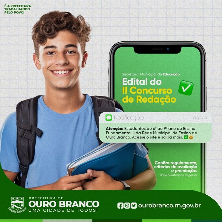 A Prefeitura Municipal de Ouro Branco-RN, por meio da Secretaria Municipal de Educação e da Comissão Especial do II Concurso Cultural de Redação, torna público o Edital do Concurso de Redação de Escrita Criativa, com temas relacionados à história do município, a ser realizado durante a semana do 21 de novembro, data em que se comemora o aniversário de Emancipação Política de Ouro Branco.