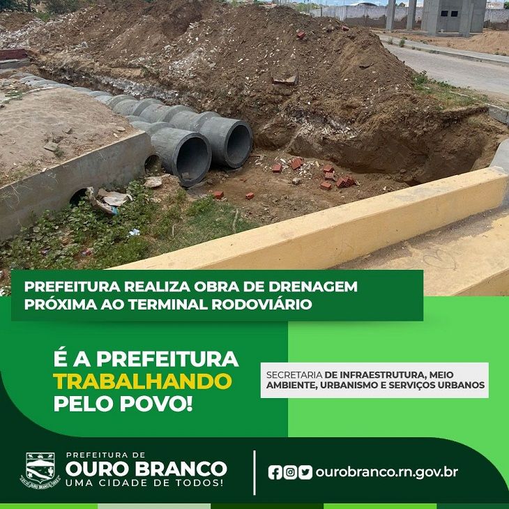 A Prefeitura de Ouro Branco-RN segue trabalhando para melhorar a infraestrutura da cidade e proporcionar mais qualidade de vida à população. Desta vez, a atenção está voltada para a área próxima ao Terminal Rodoviário, que está recebendo uma importante obra de drenagem.