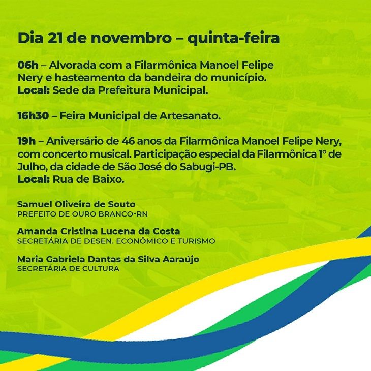 A Prefeitura de Ouro Branco, por meio das Secretarias de Cultura e de Desenvolvimento Econômico e Turismo, convida todos para celebrar essa data tão especial com uma programação repleta de cultura e tradição.