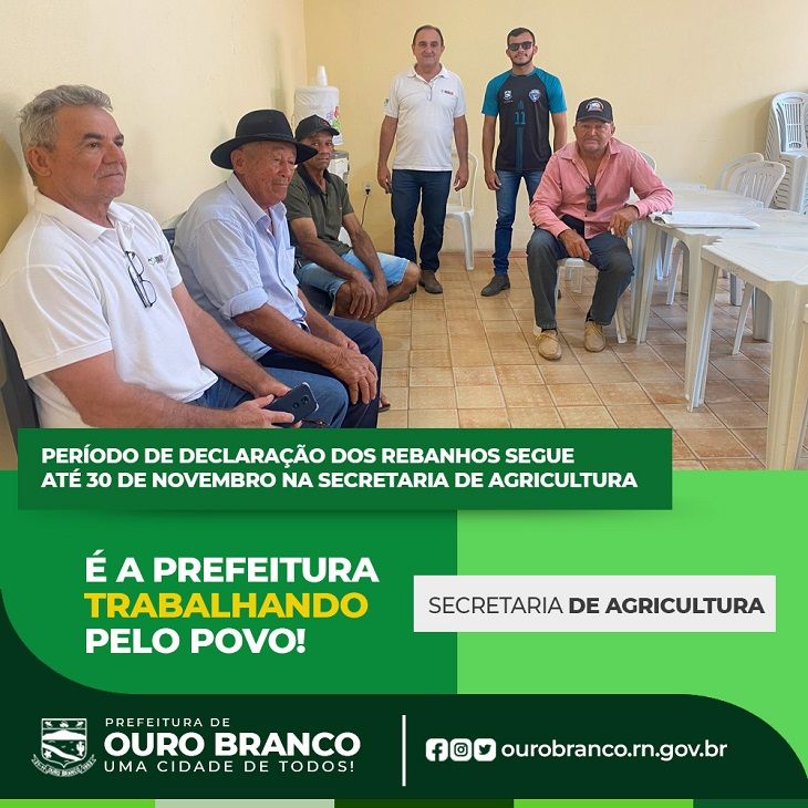 A Prefeitura de Ouro Branco, por meio da Secretaria Municipal de Agricultura, informa que o período de Declaração dos Rebanhos segue até o próximo dia 30 de novembro. O atendimento está sendo realizado na sede da Secretaria, de segunda a sexta-feira, das 06h às 11h.