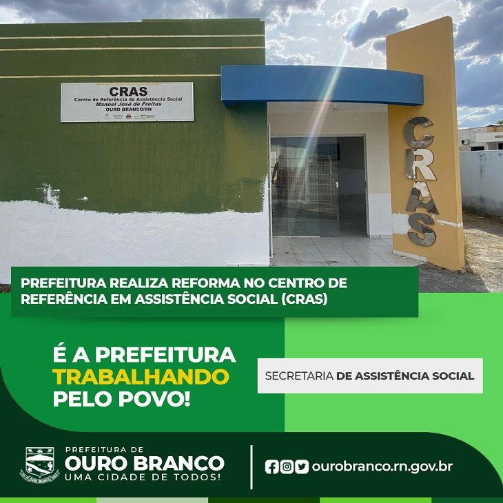 A Prefeitura de Ouro Branco-RN está realizando reforma do prédio do Centro de Referência em Assistência Social (CRAS). O espaço, que desempenha um papel essencial no acolhimento e suporte às famílias ouro-branquenses, está passando por melhorias significativas em sua estrutura, incluindo recuperação, pintura e outros ajustes necessários para garantir um ambiente mais confortável e seguro para todos os usuários e profissionais.