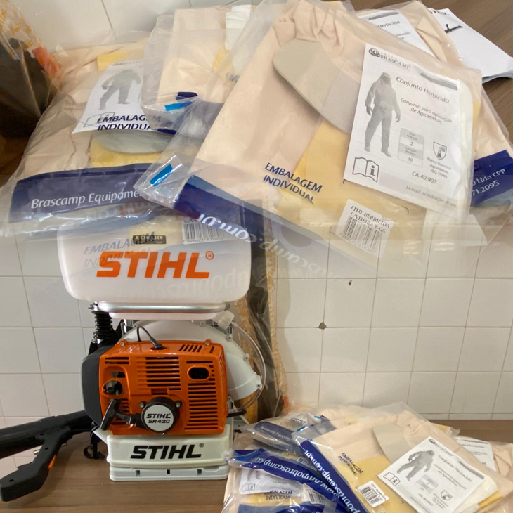 O conjunto herbicida é uma vestimenta de segurança que protege o corpo, a cabeça e o rosto dos trabalhadores durante o manuseio de produtos de pulverização, garantindo maior segurança e eficiência no trabalho. Já a bomba costal é um equipamento fundamental para pulverizar inseticidas de forma direcionada e eficaz, sendo uma importante ferramenta no combate ao mosquito Aedes aegypti, transmissor de doenças como dengue, zika e chikungunya.