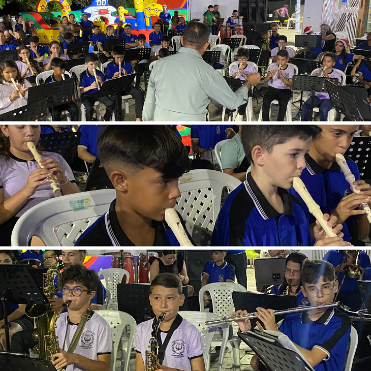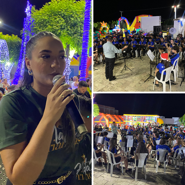 Na noite da última sexta-feira (27), a Praça Arlinda Medeiros recebeu mais uma edição do Concerto Natalino da Filarmônica Manoel Felipe, acompanhada pela Banda de Flauta Doce Urbano Medeiros e pelos aprendizes da Filarmônica.
