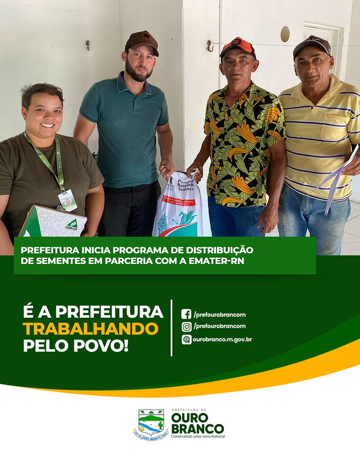 A Prefeitura de Ouro Branco, por meio da Secretaria Municipal de Agricultura, deu início ao Programa de Distribuição de Sementes, executado em parceria com a EMATER-RN. A ação beneficia agricultores locais com a entrega de sementes de milho, feijão e sorgo, essenciais para o plantio nesta safra.
