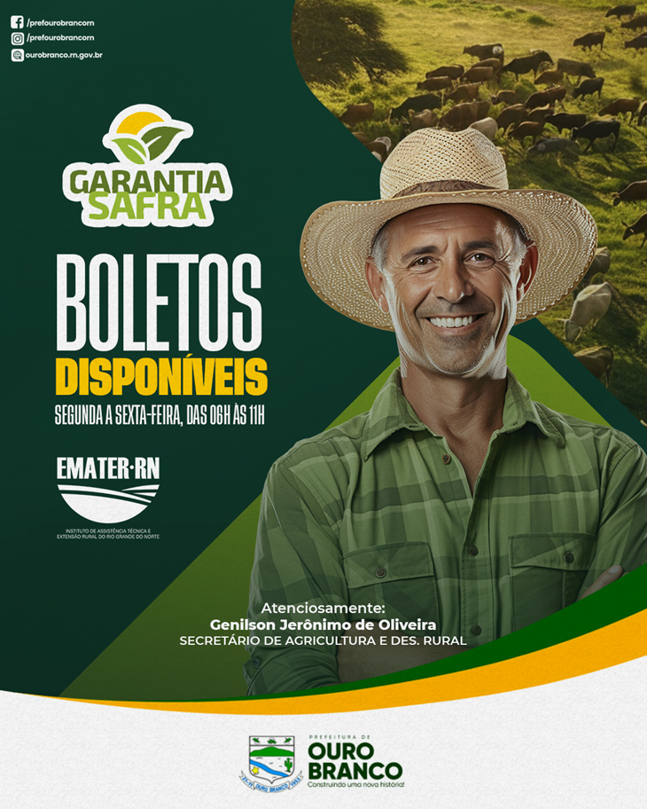A Prefeitura de Ouro Branco, por meio da Secretaria de Agricultura e Desenvolvimento Rural, em parceria com a EMATER, informa que os boletos do Garantia Safra já estão disponíveis para retirada. Os agricultores devem comparecer à sede da Secretaria, localizada na Rua João Melquiades, nº 31, de segunda a sexta-feira, das 06h às 11h.