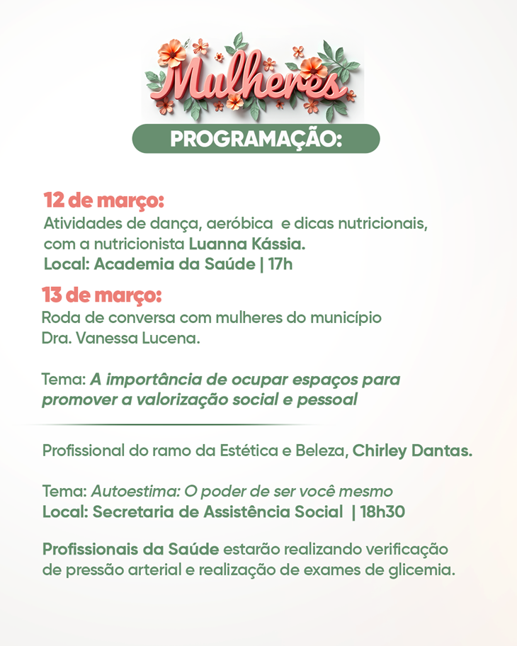 Nos dias 12 e 13 de março, teremos atividades como dança, aeróbica, dicas nutricionais e uma roda de conversa com profissionais que trarão reflexões sobre a importância de ocupar espaços e cuidar de si.