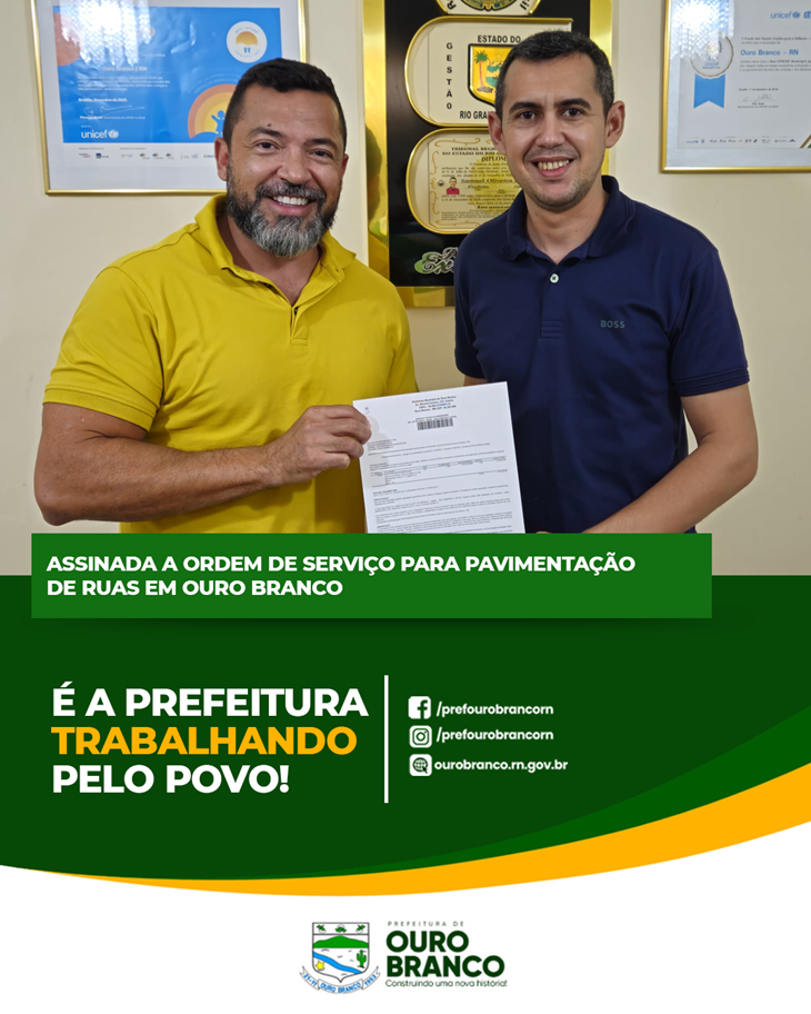 O compromisso com o desenvolvimento de Ouro Branco segue avançando! Na tarde desta segunda-feira foi assinada a Ordem de Serviço para a pavimentação de ruas, garantindo mais infraestrutura e qualidade de vida para a população.