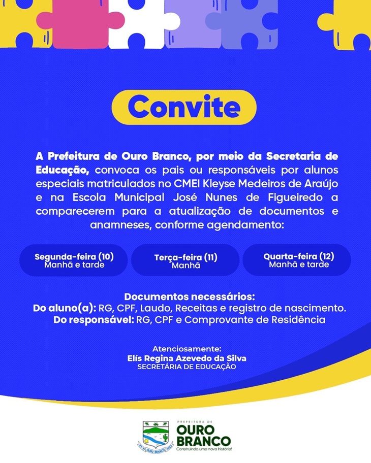 A Prefeitura de Ouro Branco, por meio da Secretaria de Educação, convoca os pais ou responsáveis por alunos especiais matriculados no CMEI Kleyse Medeiros de Araújo e na Escola Municipal José Nunes de Figueiredo para a atualização de documentos e anamneses. O comparecimento é essencial para garantir o acompanhamento adequado dos alunos.