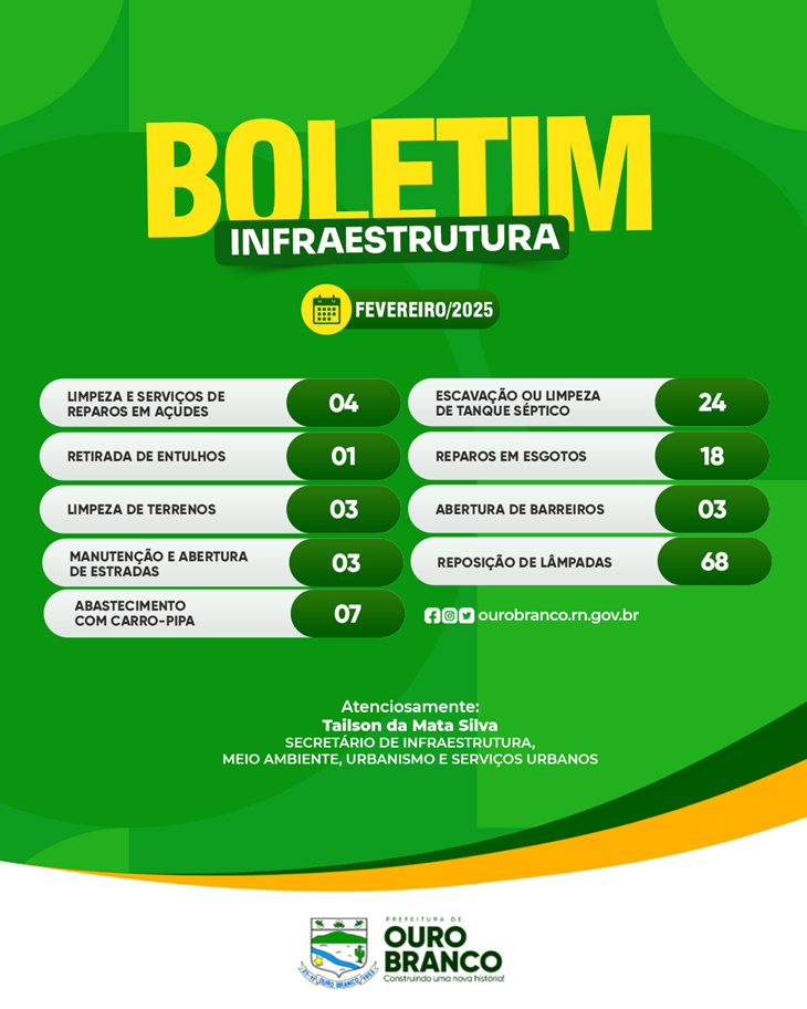 A Prefeitura de Ouro Branco, por meio da Secretaria Municipal de Infraestrutura, Urbanismo, Meio Ambiente e Serviços Urbanos, divulga o Boletim de Produção de fevereiro de 2025. O relatório apresenta o quantitativo de serviços realizados, reforçando o compromisso com a transparência e o desenvolvimento da cidade.