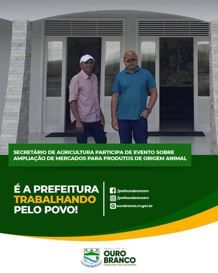 O Secretário de Agricultura e Desenvolvimento Rural de Ouro Branco, Genilson Jerônimo, juntamente com Veterinário do município, Antônio Carlos, participou na última terça-feira (18) do evento de apresentação do Projeto de Ampliação de Mercados de Produtos de Origem Animal (Oficinas ConSIM), voltado para os municípios consorciados ao Consórcio Intermunicipal Multifinalitário do Seridó (CIM Seridó).