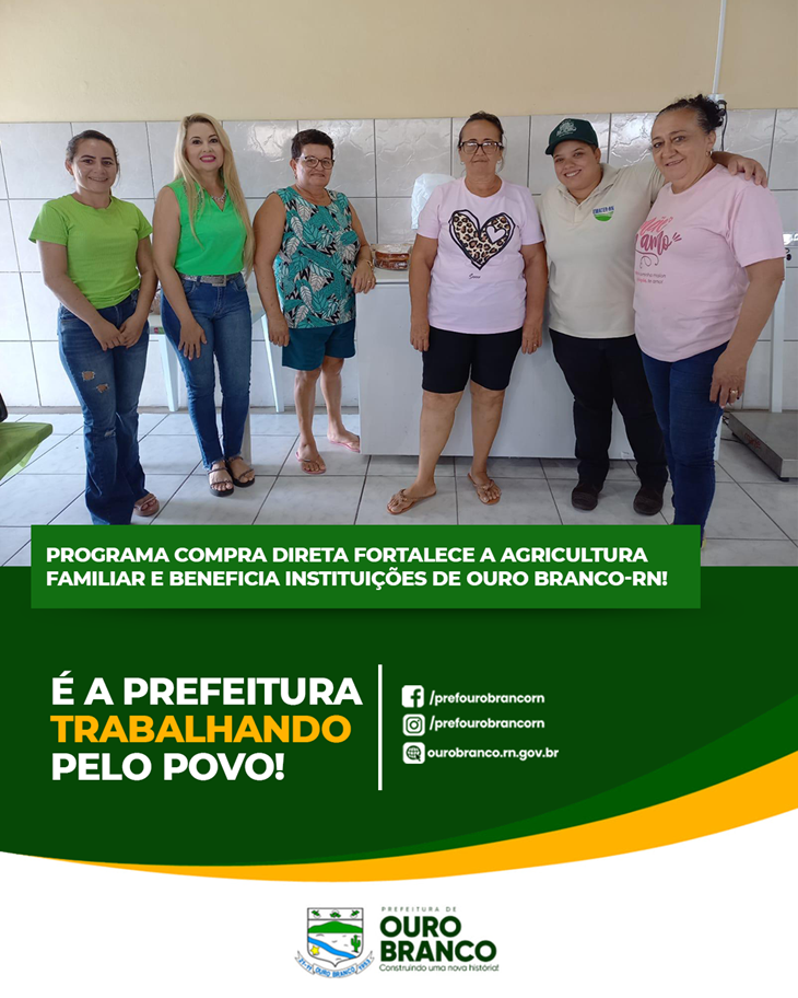 O Programa Compra Direta, uma modalidade do Programa de Aquisição de Alimentos (PAA), tem desempenhado um papel fundamental no fortalecimento da agricultura familiar e na segurança alimentar de diversas instituições em Ouro Branco-RN. O programa é fruto de um convênio firmado entre a Emater-RN e o Governo Federal, sendo financiado com recursos do Ministério da Cidadania e executado pelo Governo do Estado, por meio da Emater-RN, em parceria com a Prefeitura Municipal de Ouro Branco e suas secretarias.