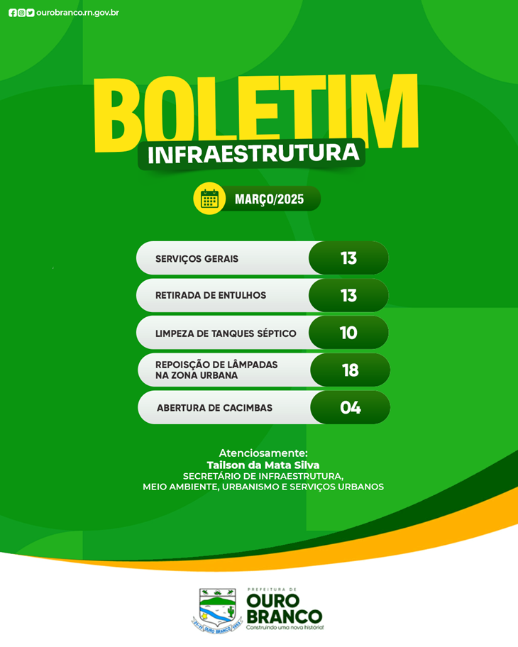 A Prefeitura de Ouro Branco, por meio da Secretaria Municipal de Infraestrutura, Urbanismo, Meio Ambiente e Serviços Urbanos, torna público o Boletim de Produção referente ao mês de março de 2025. O levantamento apresenta o quantitativo de serviços executados pela equipe da Secretaria, reforçando o compromisso com a transparência e o desenvolvimento da cidade.