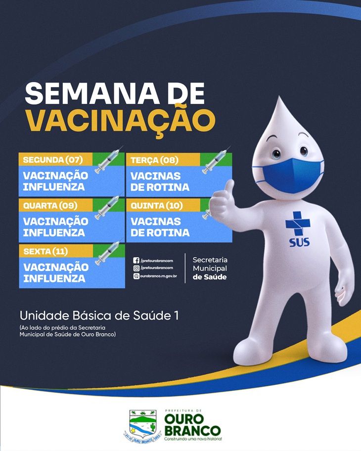 A Prefeitura de Ouro Branco, por meio da Secretaria Municipal de Saúde, informa o cronograma da Sala de Vacina a partir do dia 7 de abril de 2025.