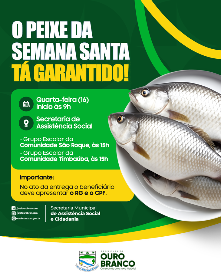 A Prefeitura de Ouro Branco, por meio da Secretaria Municipal de Assistência Social e Cidadania, realizará, nesta quarta-feira, 16 de abril, a entrega do peixe da Semana Santa.