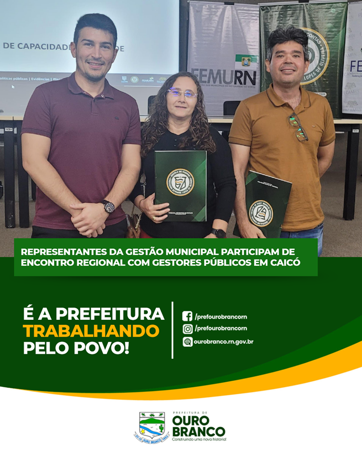 O município de Ouro Branco esteve representado por uma equipe técnica composta por: Heudes Nóbrega (Secretário Municipal de Finanças e Tributação), Ray Ramos (Tesoureiro Municipal), Alcione Rocha (Controladora Municipal), Luanna Elízia (Presidente do Instituto de Previdência Própria), Juliana Lucena (Procuradora Previdenciária) e Silvânia de Medeiros (Contadora).