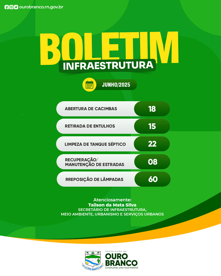 A Prefeitura de Ouro Branco, por meio da Secretaria Municipal de Infraestrutura, Urbanismo, Meio Ambiente e Serviços Urbanos, divulga o Boletim de Produção de junho de 2025. O relatório apresenta o quantitativo de serviços realizados, reforçando o compromisso com a transparência e o desenvolvimento da cidade.