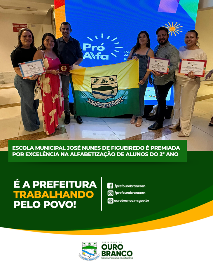 O município de Ouro Branco foi representado na cerimônia de premiação pelo Prefeito Samuel Souto; pela Secretária Municipal de Educação, Elís Regina; pelo Diretor e Vice-diretora da escola premiada, Kiarelly Martins e Dalisângela Kecia; pela Coordenadora Pedagógica, Solemar Figueiredo; e pela Articuladora Municipal da Rede Nacional de Articulação de Gestão, Formação e Mobilização (RENALFA), professora Fihama Brenda.
