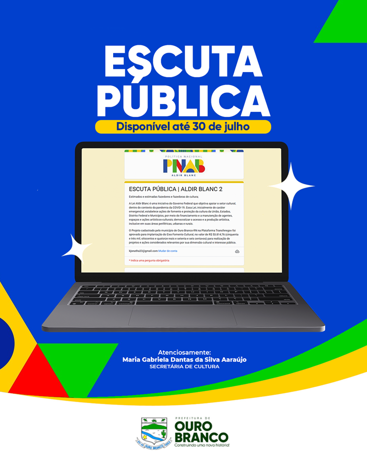 A Prefeitura de Ouro Branco, por meio da Secretaria Municipal de Cultura, iniciou o período de escuta pública online da Política Nacional Aldir Blanc de Fomento à Cultura (PNAB), com o objetivo de ouvir os agentes culturais do município e construir, de forma participativa, o Plano de Aplicação dos Recursos que serão destinados à cidade.