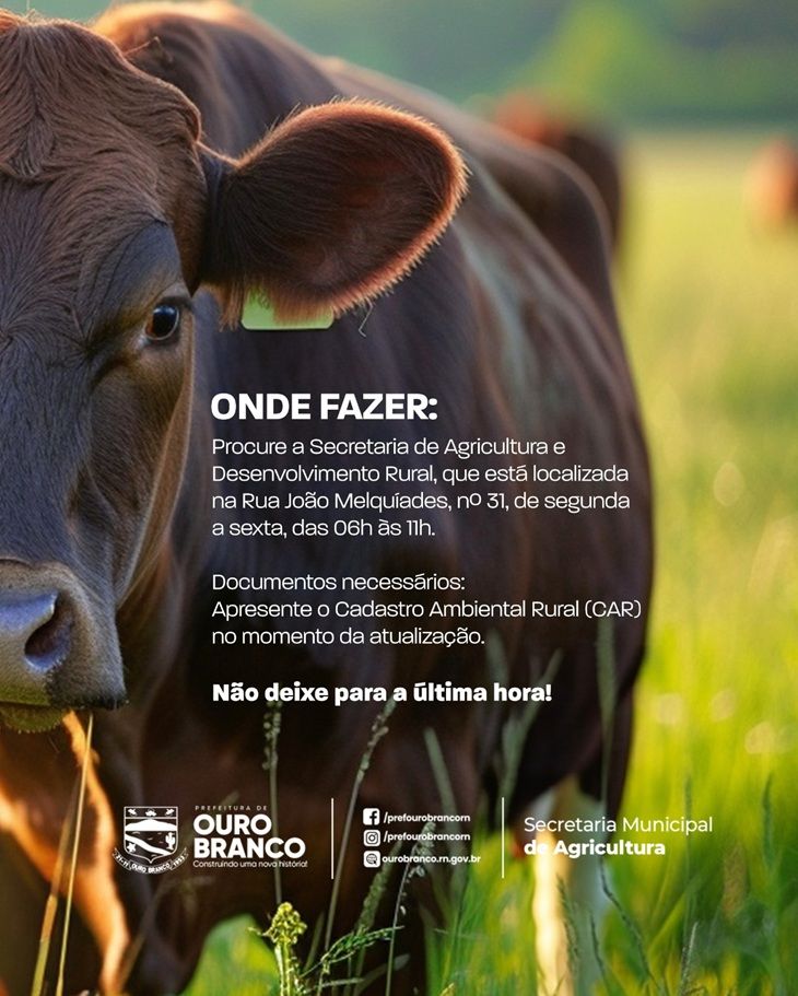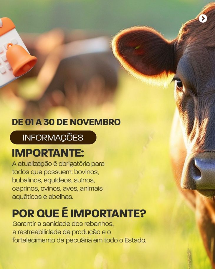 Lembre-se: leve o Cadastro Ambiental Rural (CAR) no momento da atualização. Essa declaração é obrigatória e garante a sanidade dos rebanhos, a rastreabilidade da produção e o fortalecimento da pecuária em todo o Estado.