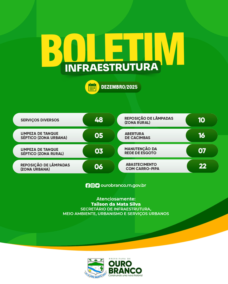 A Prefeitura de Ouro Branco, por meio da Secretaria Municipal de Infraestrutura, Urbanismo, Meio Ambiente e Serviços Urbanos, divulga o Boletim de Produção referente ao mês de dezembro de 2025. O documento apresenta um panorama dos serviços realizados no período, reforçando o compromisso da gestão com a transparência e com o avanço do município.