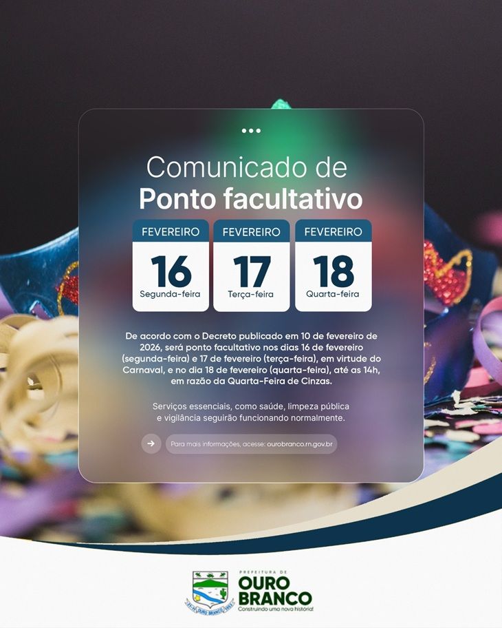 A Prefeitura reforça que a medida busca assegurar organização administrativa durante o período festivo, ao mesmo tempo em que preserva a prestação de serviços fundamentais à população de Ouro Branco.