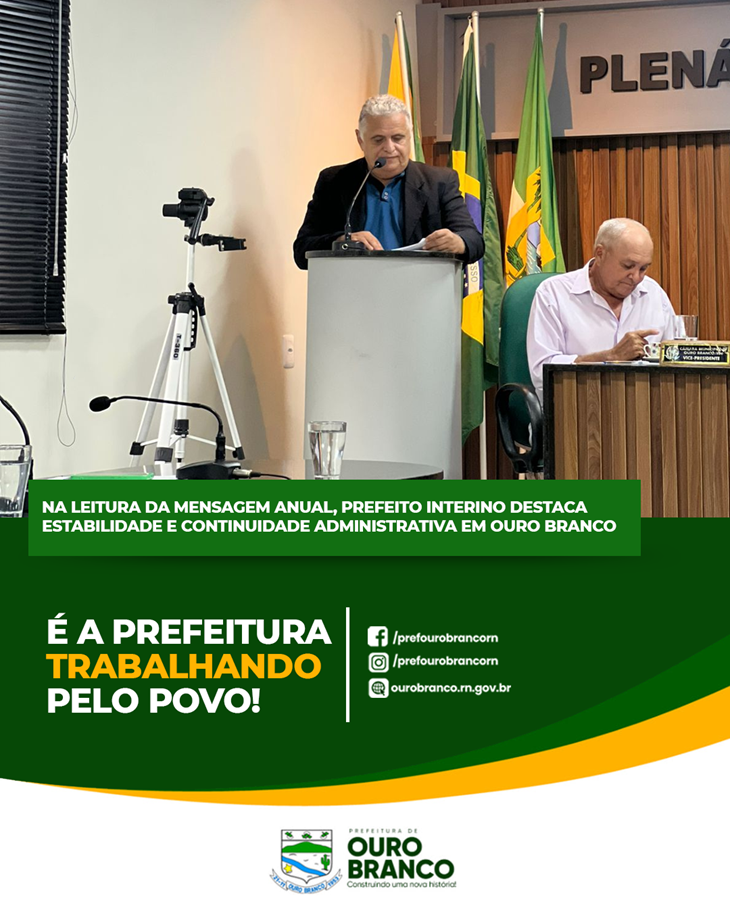Na tarde de segunda-feira (23), o prefeito interino Amariudo dos Santos realizou a leitura da Mensagem Anual ao Legislativo e à população de Ouro Branco, durante sessão na Câmara de Vereadores. O pronunciamento foi marcado por um tom de responsabilidade institucional e compromisso com a manutenção da normalidade administrativa no município.