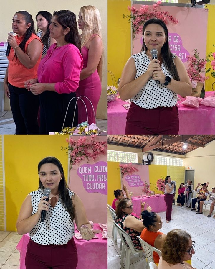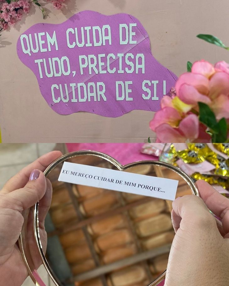 A atividade foi conduzida a partir do tema “Quem cuida de tudo, precisa cuidar de si”, trazendo uma reflexão sobre autocuidado, valorização pessoal e saúde emocional das mulheres.