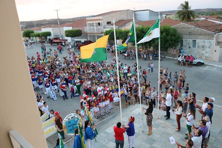 Nesse momento a secretária de educação - Meirielle Lucena agradeceu a presença de todos e convidou a prefeita doutora Fátima, o professor de Matemática - Itan Marinheiro e o estudante Kaio Emmanuel (medalha de bronze na OBMEP) para o hasteamento das bandeiras enquanto todos cantaram o Hino Nacional Brasileiro.